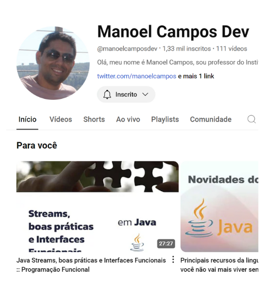 Fundador do canal @manoelcamposdev no Youtube, onde tento abordar de forma prática e sem enrolação, diversos assuntos relacionados a desenvolvimento e engenharia de software em geral, aliando fundamentação teórica e prática.
